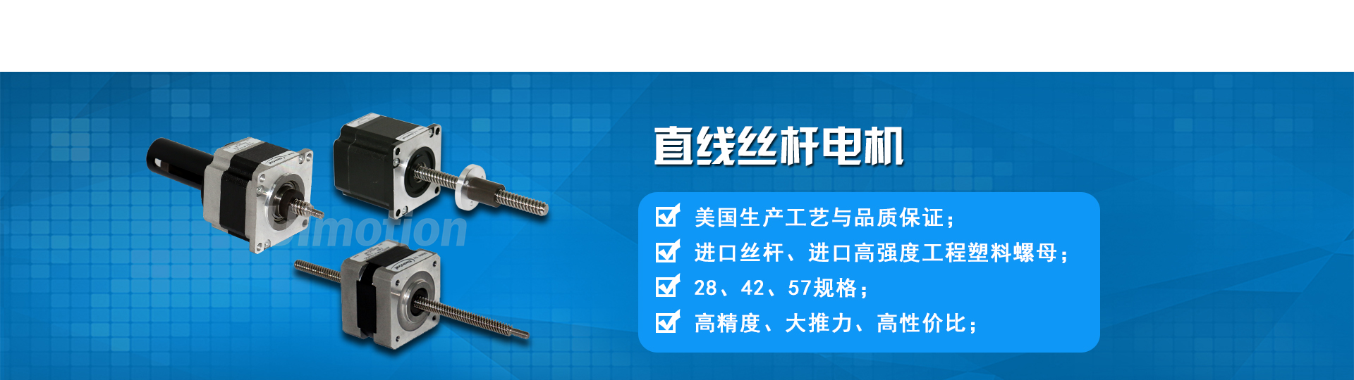 主要產品:高精度絲桿步進電機、一體式步進電機、CAN/RS485/RS232/EtherCAT步進驅動器、直流伺服一體機。